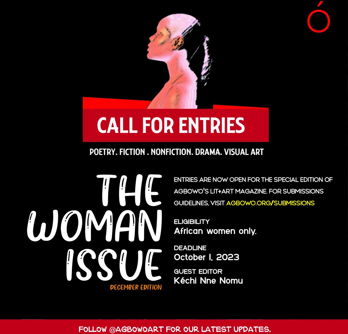 To submit your work for Agbowó magazine’s “Woman” issue, please send your prose, non-fiction, poetry, or visual arts/photography and plays submissions as MS Word attachments or high-resolution images to prose.agbowo@gmail.com, essays.agbowo@gmail.com, poetry.agbowo@gmail.com, visualarts.agbowo@gmail.com, and drama.agbowo@gmail.com respectively. Go to agbowo.org/submissions for guidelines for each genre.