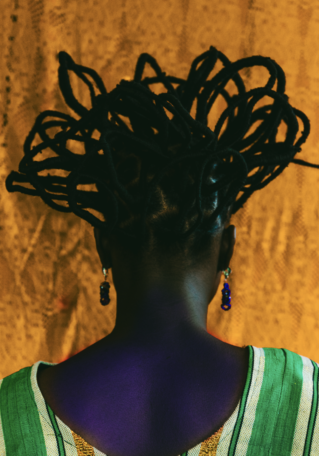 Adedayo: bell hooks’s “oppositional gaze” grounds the idea that Black women have been practicing looking back, looking askance, or withholding visibility as acts of resistance within visual regimes that sought to fix or punish their gaze; hooks links this rebellious spectatorship to everyday micro-gestures that reclaim power. While bell hooks brilliant observation does not entirely capture the diversity of african women, many of your portraits avert the sitter’s eyes, plunge features into cobalt shadow, or crop the head so that jewelry and skin shimmer speak where the face does not and these recall hooks’s insistence on strategic refusal, and echo how you edit what stays in or out of the frame to protect your subjects. How do you choreograph levels of access—what strangers get to see, what remains intimate—and do you negotiate different “cuts” of an image (public, community, private) to honor a sitter’s boundaries? Where in your workflow do conversations about gaze, consent, and circulation happen?