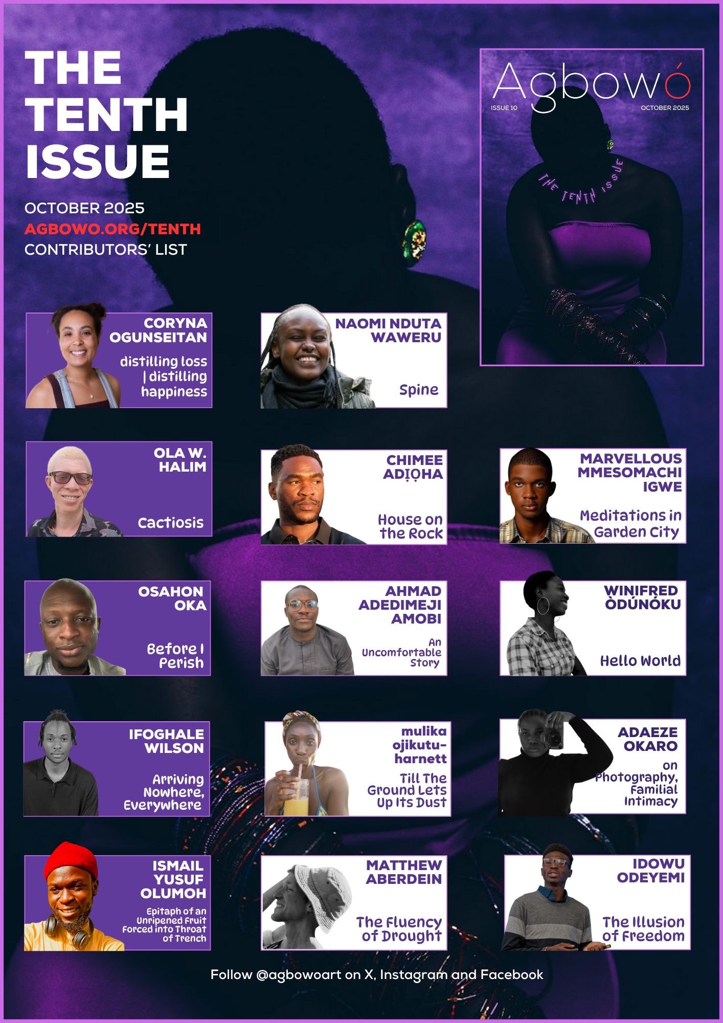 My work at Agbowó has now come full circle. I have been travelling the American West since September, and this past week, I read in Decorah, a small town in Iowa. It was in Iowa, sitting in my small, shared apartment in Coralville as it snowed outside in December 2021, that I curated my first issue as Editor-in-Chief. Now, I am in Los Angeles, in a large room with large windows, and it is Agbowó’s 10th Issue, my final delivery.